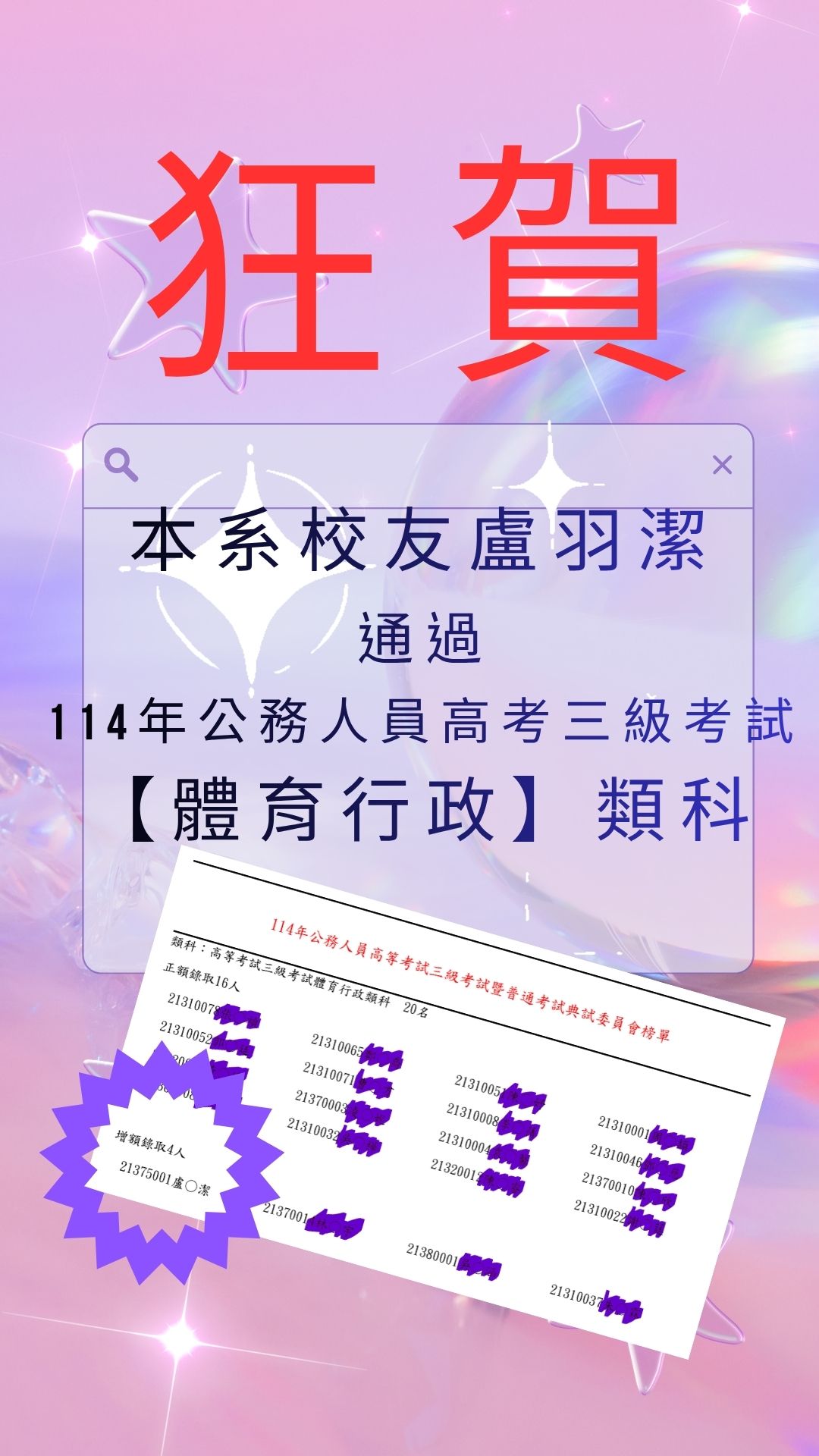 狂賀🎉🎉 本系大學部113級畢業生盧羽潔(1099046)校友通過114年公務人員高考三級考試【體育行政】類科!!